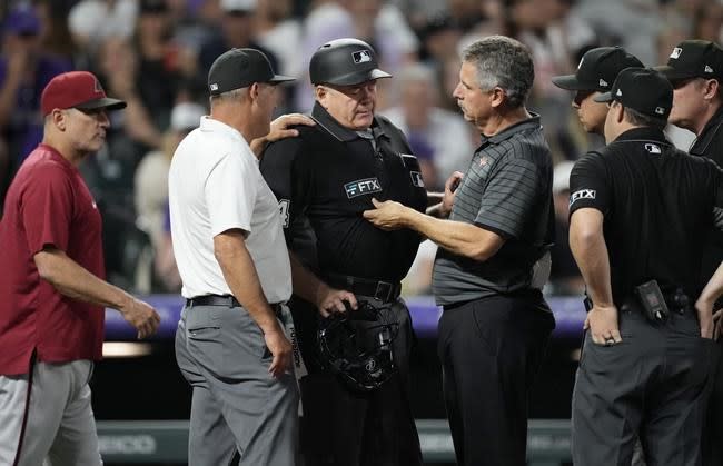 Residence plate umpire Jerry Layne needed to go away the sport within the backside of the sixth inning after a foul tip off the bat of Randal Grichuk struck the higher fringe of his facemask. Layne left the sector beneath his personal energy, escorted by Rockies medical personnel for additional examination and therapy. The sport was delayed for a number of minutes whereas Chad Whitson donned protecting gear earlier than shifting behind the plate. Layne had initially dominated that Grichuk had been hit by the pitch, however replay assessment decided that the ball nicked the knob of Grichuk’s bat earlier than skipping off catcher Carson Kelly’s glove and placing Layne’s masks.